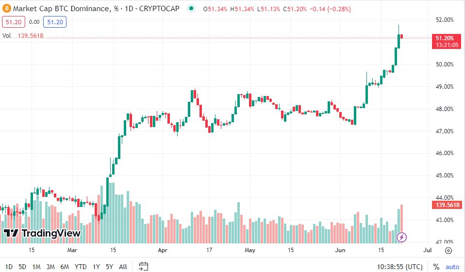 Notably, Bitcoin performed exceptionally well, hitting a market dominance of 50% for the first time in two years, according to data from TradingView.